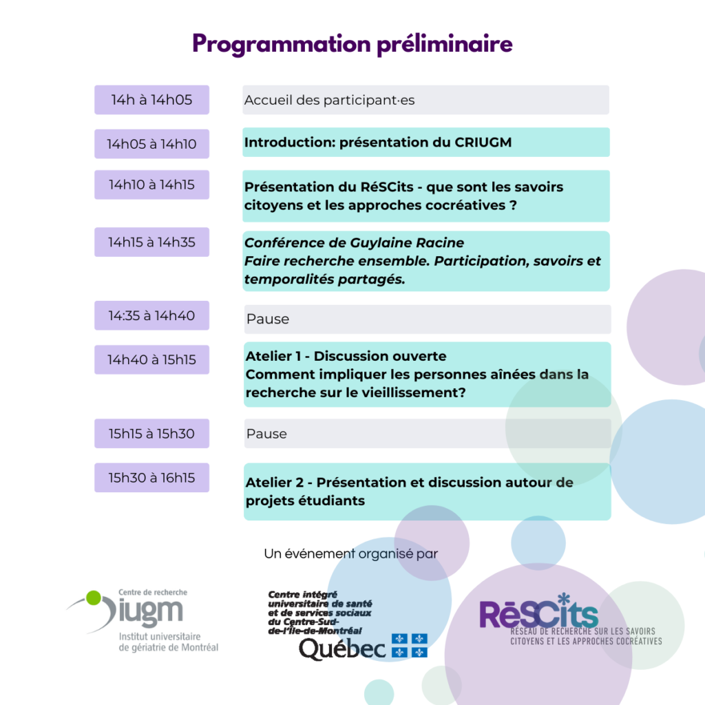 Objectif: Une rencontre pour discuter sur les expériences, bonnes pratiques, les enjeux de la recherche par, pour et avec les personnes aînées.